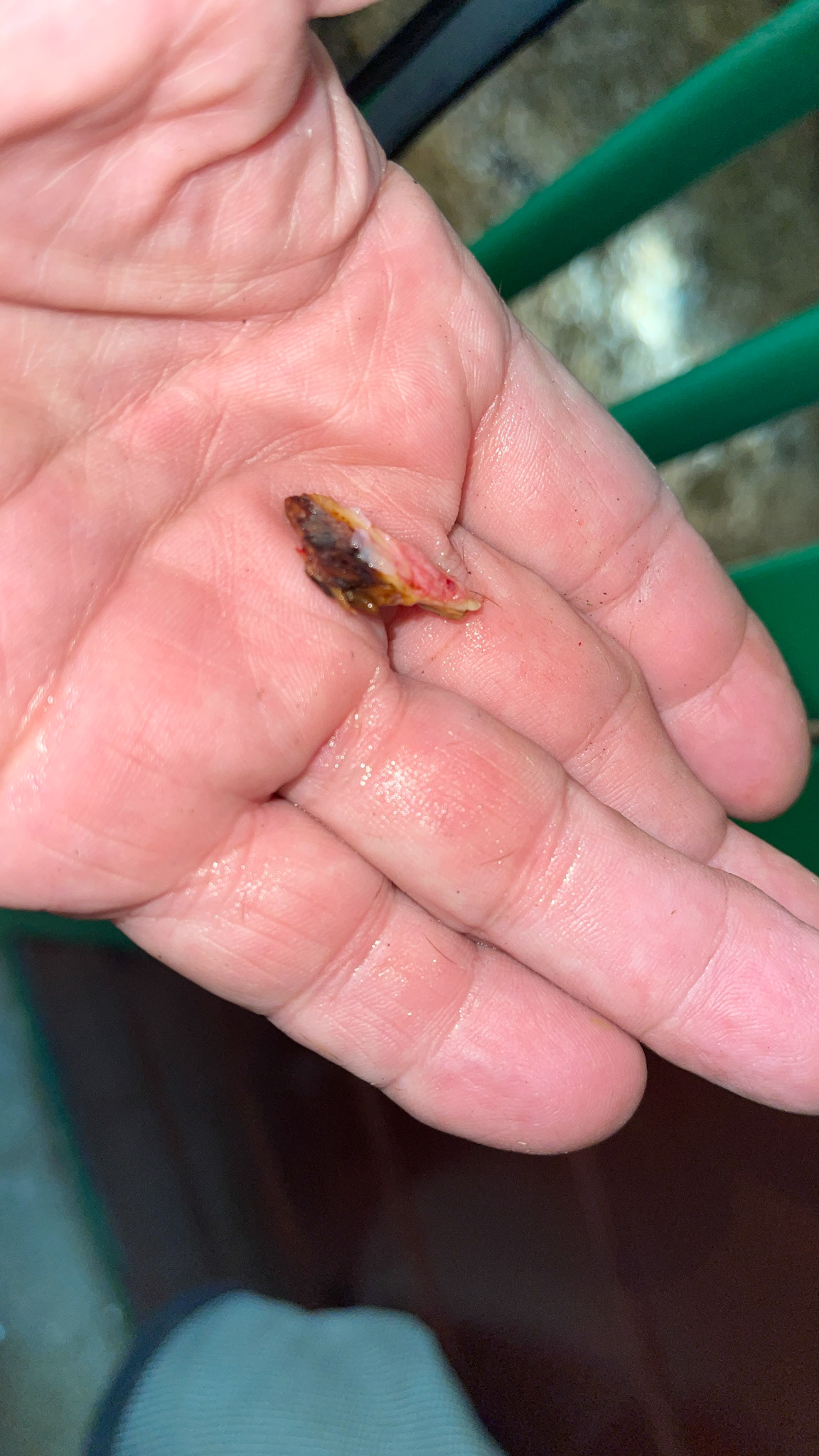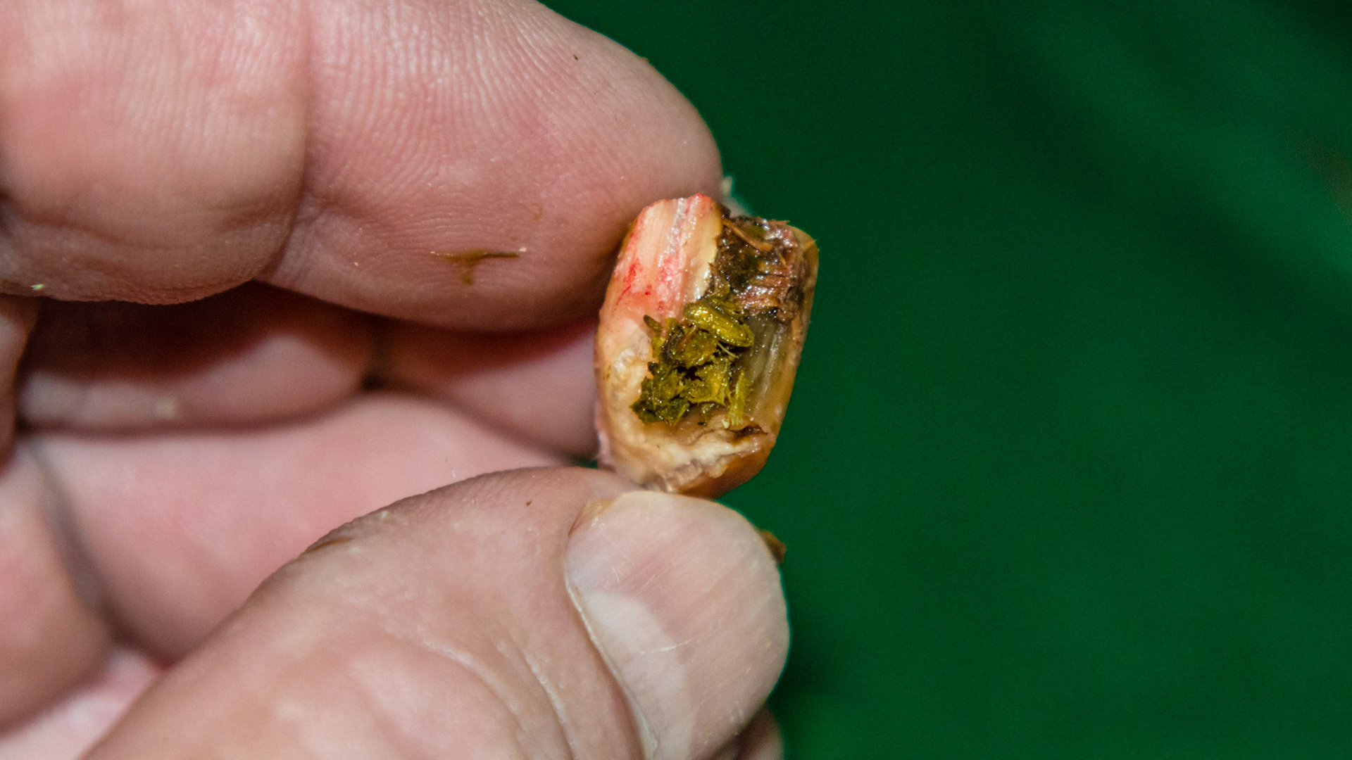 The thumb is on the occlusal surface of this 408 medial sagittal and transverse cheek tooth fragment. The red tag of gum was its only attachment on the lingual surface.