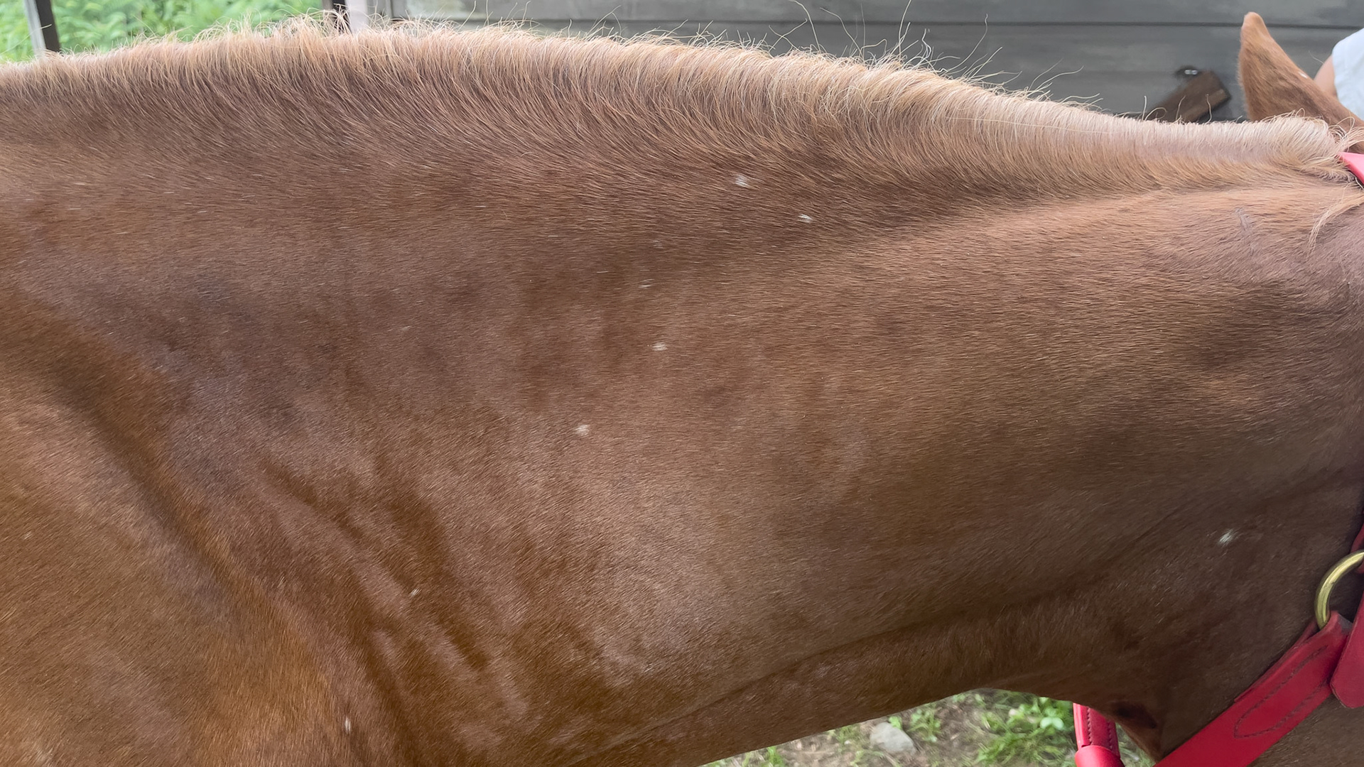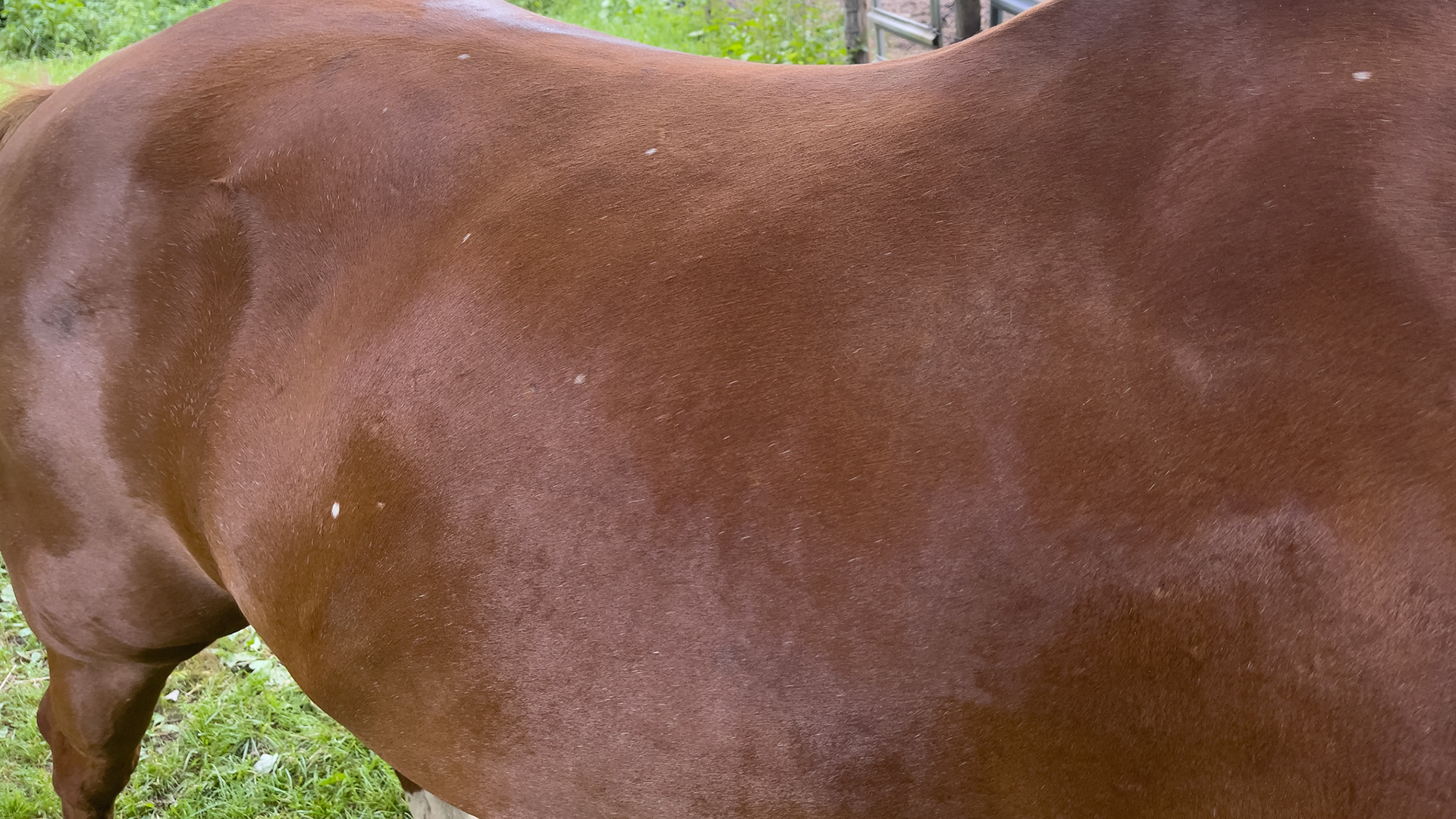 Spontaneous spotted leukotrichia. This horse was a pure chestnut on Saturday and had white spots throughout his hair coat on Sunday. Diagnosed at the University of Florida veterinary college, the cause is unknown. I read many years ago that spontaneous white spots in horses could be from a specific mineral deficiency, but there is no proof. If it was a mineral deficiency then how could this cooer “overnight?”