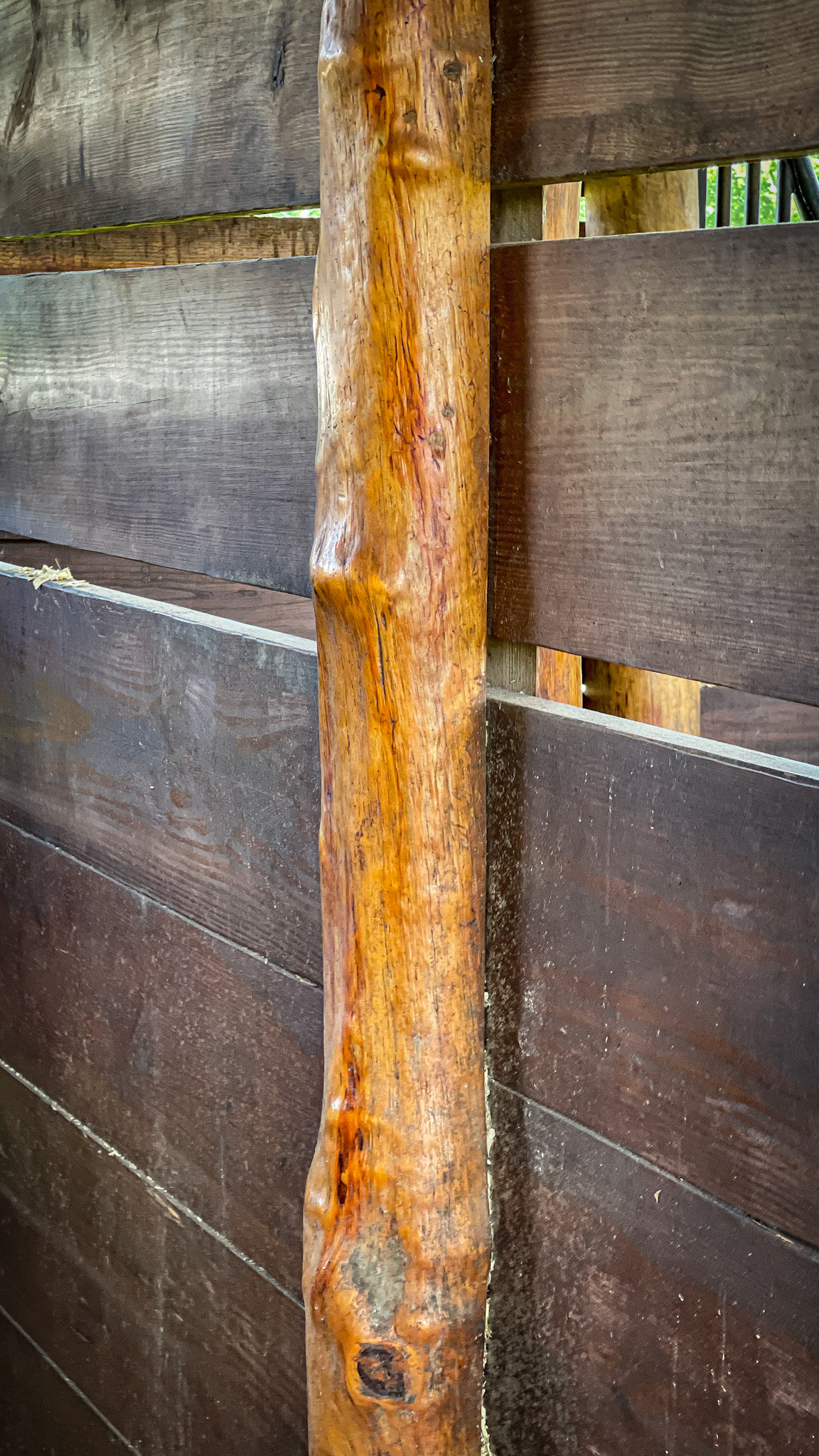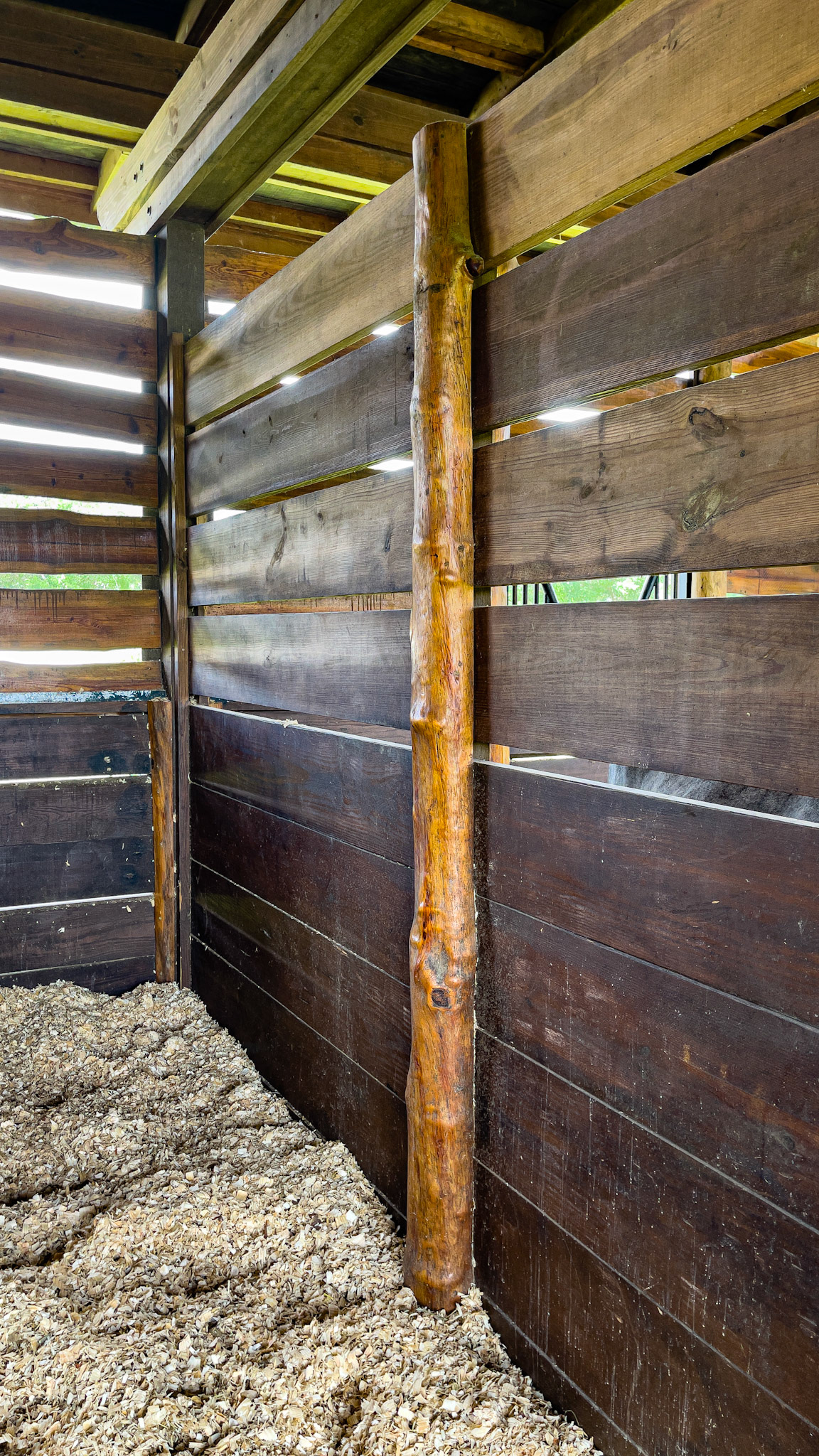 Stall wall with a sandwich board and the upper boards separated for ventilation. Carriage bolt heads do not need recessing