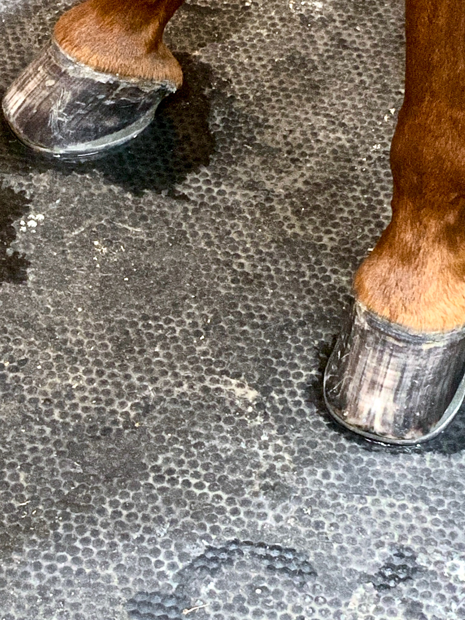 The owner complained about the unusual stripes on the hoof but what was more noticeable was the offset shoes set wide to the hoof wall to compensate for the vertical wall on the inside of the RF and the outside of the LF. The idea here is to trick the hoof growth to draw its growth to the outside edge of the show where the hoof wall belongs.